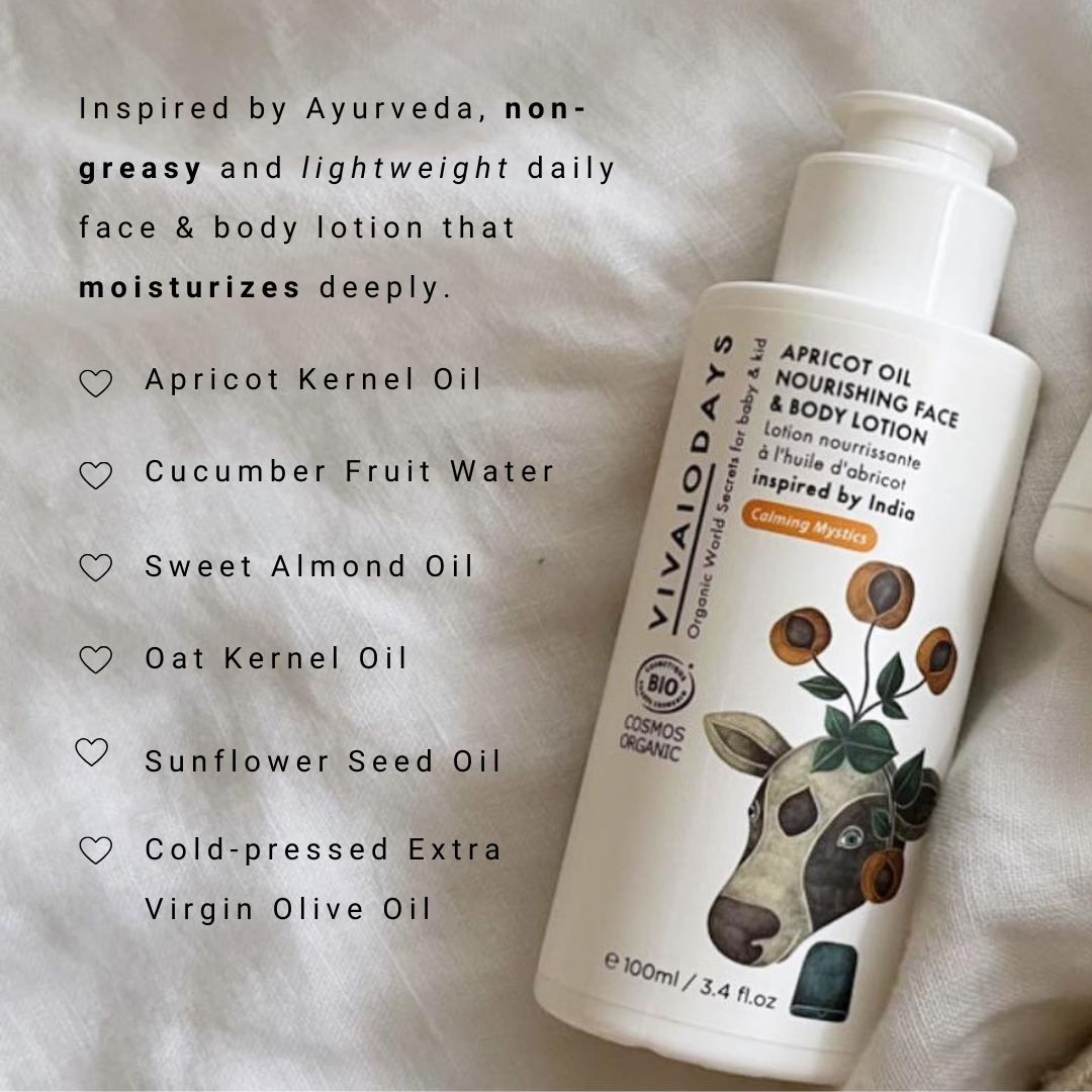 Ayurveda-inspired nourishing face & body lotion formulated with Apricot Kernel Oils- one of the mildest and gentlest oils for baby's delicate skin. It resembles skin's natural sebum to form a protective barrier especially important for compromised skin caused by eczema & rashes. Oat Kernel Oil works as a healer and Cucumber Fruit Water calms, soothes irritated skin.